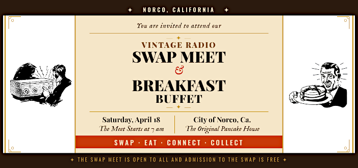 SCARS will present a swap meet and breakfast buffet in Norco Ca. on April 18, 2026. Details.